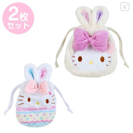 HELLO KITTY 日版 短耳兔造型 大頭 毛絨 毛草茸 索袋 索繩袋 收納袋 小物袋 索繩包 2個 套裝 凱蒂貓 2024 (復活節系列) 【平行進口】