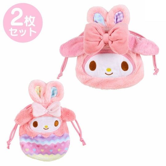 MY MELODY 日版 短耳兔造型 大頭 毛絨 毛草茸 索袋 索繩袋 收納袋 小物袋 索繩包 2個 套裝 美樂蒂 2024 (復活節系列) 【平行進口】