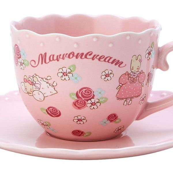 SANRIO-MARRON CREAM 茉莉兔 日版 餐具 花邊造型 陶瓷 杯 連杯碟 杯托 套裝 水杯 咖啡杯 茶杯 兔媽媽 2023 (粟子奶油菓子設計系列) 【平行進口】