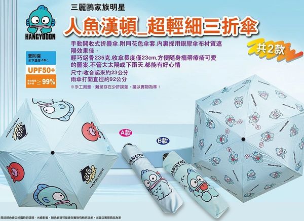 SANRIO-HANGYODON 水怪 正版 銀膠布 防UV 雨傘 輕巧 縮骨遮 短遮 摺疊傘 戶外 便攜 雨具 53CM 2024年款 海怪 人魚漢頓 (A款)【平行進口】
