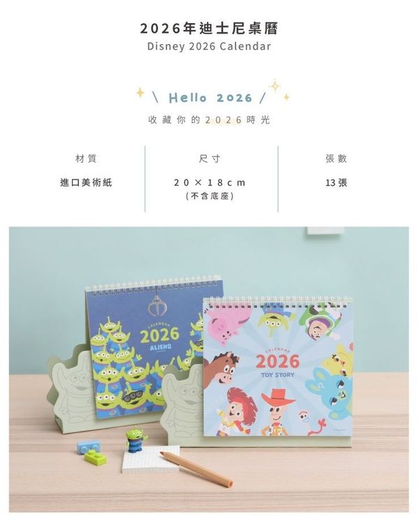 NORNS-迪士尼 DISNEY 反斗奇兵 TOY STORY 三眼仔 正版 2026 桌上 線圈 座檯 月曆 桌曆 枱曆 家居 台灣假期 PIXAR 玩具總動員 ALIENS【平行進口】