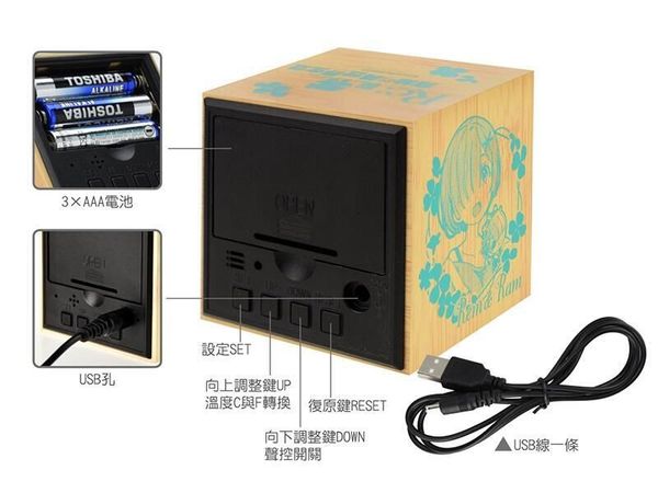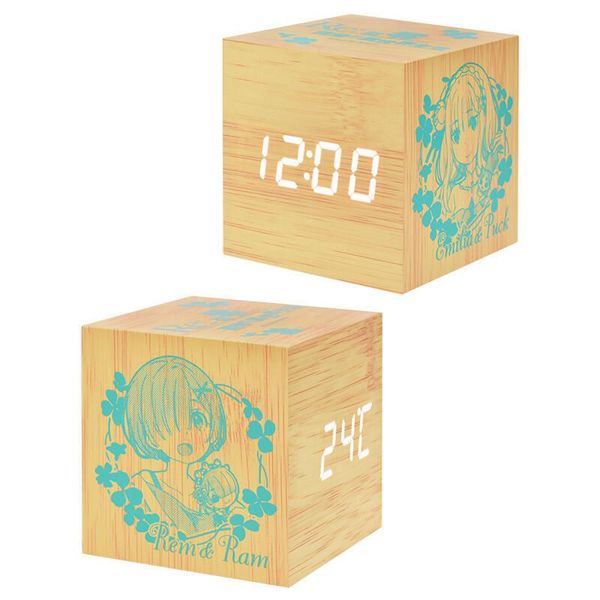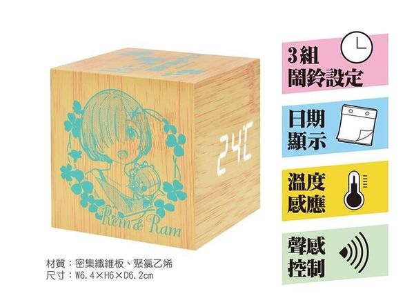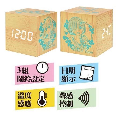 MUSE-RE:ZERO 從零開始的異世界生活 正版 桌上 方形 LED 木紋鐘 USB 數字 鬧鐘 溫度感應 聲控 木棉花 愛蜜莉亞X雷姆 (D款) 【平行進口】