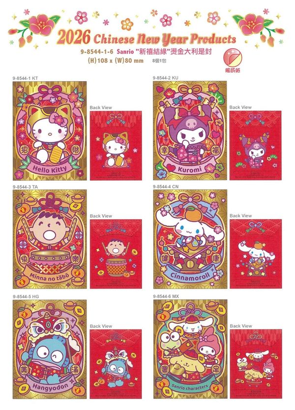 SANRIO-HELLO KITTY 港版 2026 馬年 賀年 新禧結緣 招財 燙金 利是封 8個裝 紅封包 紅包 壓歲錢 新年 凱蒂貓 吉蒂貓 凱蒂貓 吉蒂貓