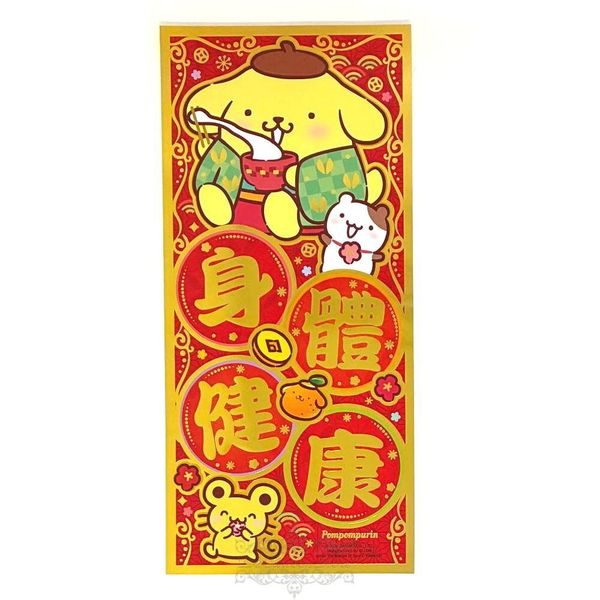 SANRIO-POMPOMPURIN 布甸狗 港版 2026 馬年 賀年 直款 紅色 金邊框 雙賀語 揮春 30.5X14CM 新年 裝飾 布丁狗 (身體健康)