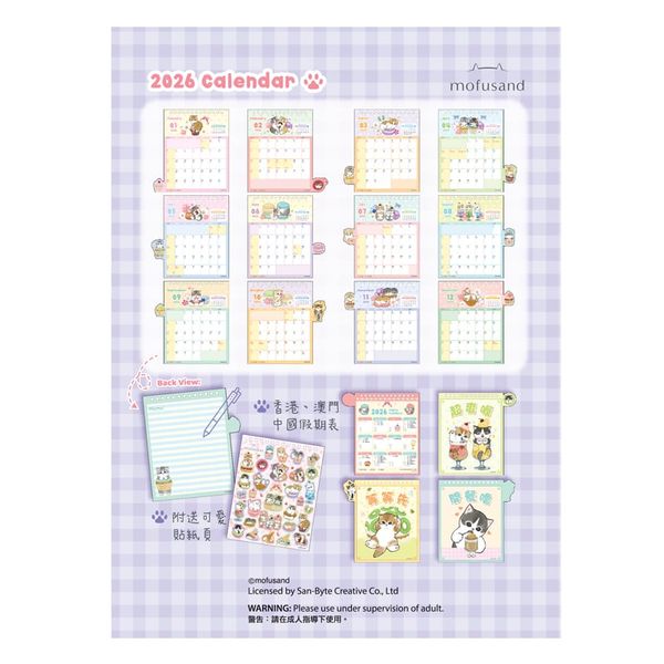 貓福珊迪-MOFUSAND 港版 2026 桌上直身 線圈 座檯 直款 年曆 月曆 日曆 附貼紙 香港假期 貓福珊迪