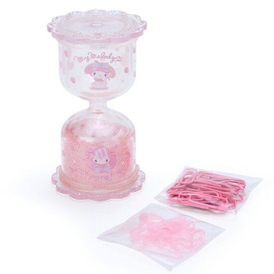 MY MELODY 日版 文具 萬字夾 橡皮筋 套裝 連 沙漏 造型 收納盒 迴紋針 漏斗 小物盒 橡筋 橡皮筋 套裝 橡根 美樂蒂 2019年款 【平行進口】